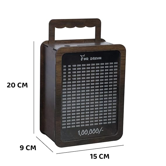 Wooden Dream Money Bank with Currency Display, Travel Bag Design, 100000 INR Savings Goal, Wooden Coin Box, Stylish Savings Box